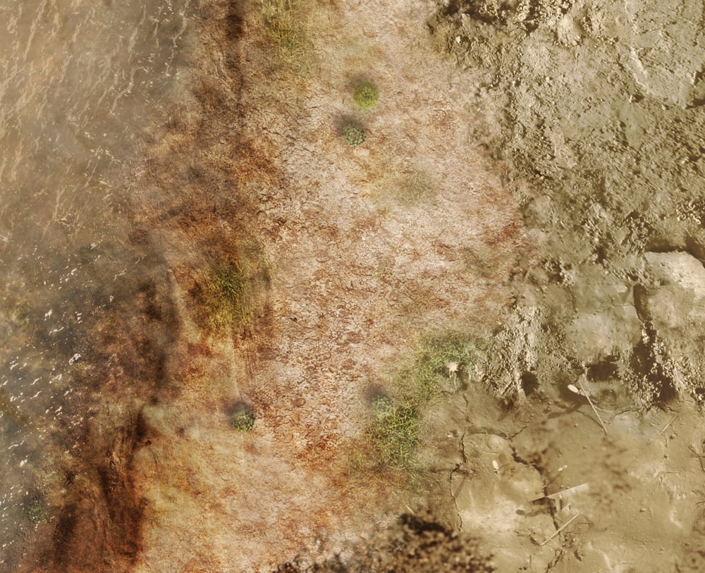The "Muddy river" mat (#870) is a versatile terrain mat! It is professionally illustrated and has a lot of "texture" to it that will make your figures, buildings and terrain really stand out! This is a fantastic base mat to use for your games. You can use the mat "as is" or layer it with your own roads, trees, buildings and other pieces of terrain!
