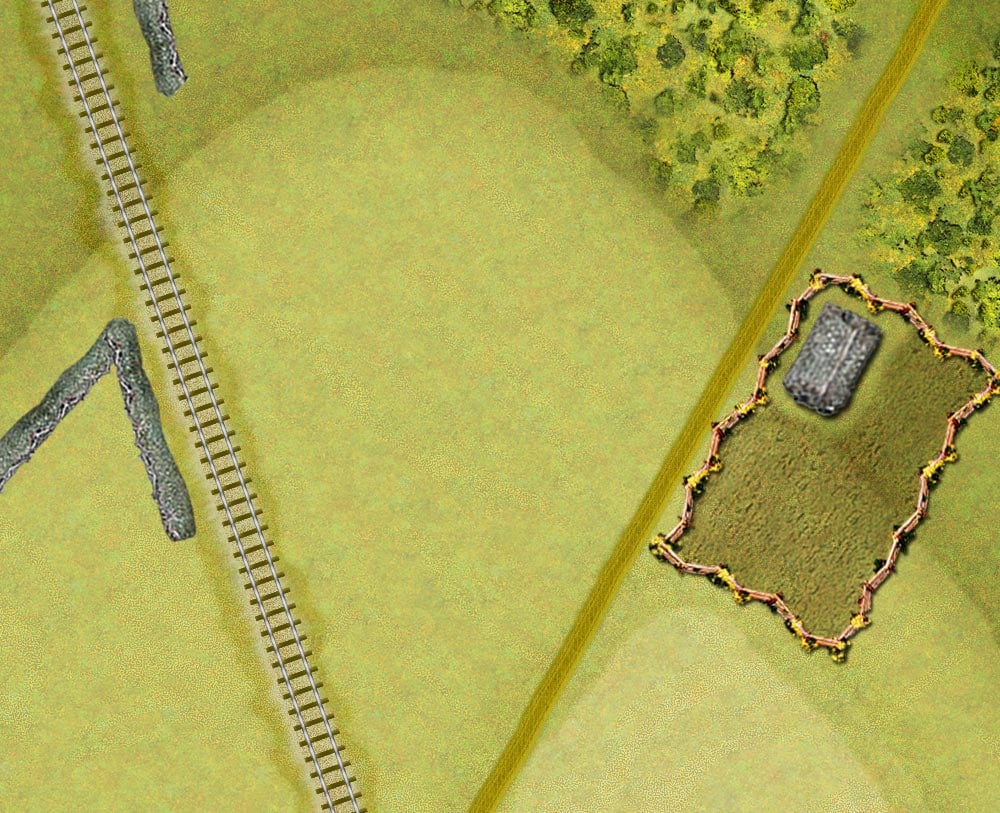 The mat features all of the images depicted in the artwork such as: roads (1/2 inch wide), trails, buildings, railroad tracks, fences, etc. Just add your troops and play!